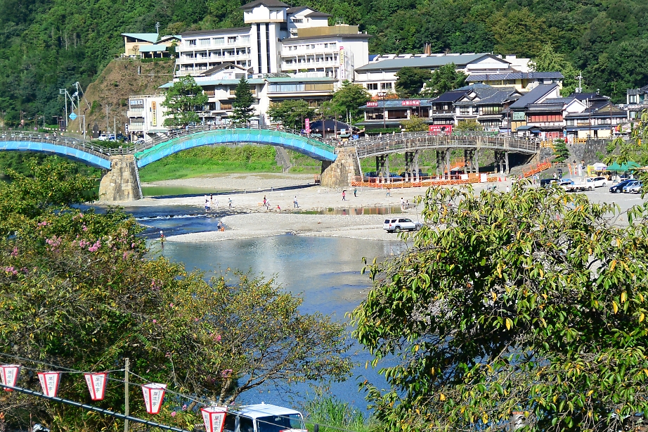宿から見える「錦帯橋《、残念ながら工事中のためブルーシートで覆われています。